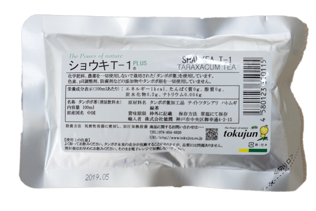 - たんぽぽ茶ショウキT-1 Plusは安全性を重視した結果、食品添加物、防腐剤を一切使用していません。食品添加物、防腐剤を一切使用せず加工するため、1回分を飲みきりレトルトパックで密封しております。